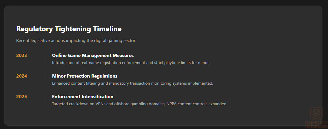 - 2025: Intensified internet enforcement against unauthorized gambling platforms and VPN circumvention