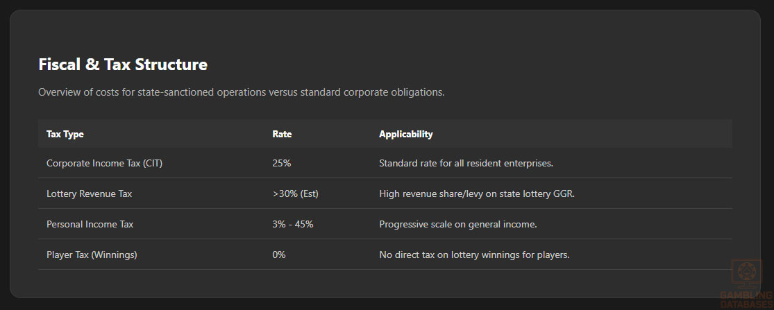 | Corporate Income Tax | Standard 25% applied to state lottery operators |