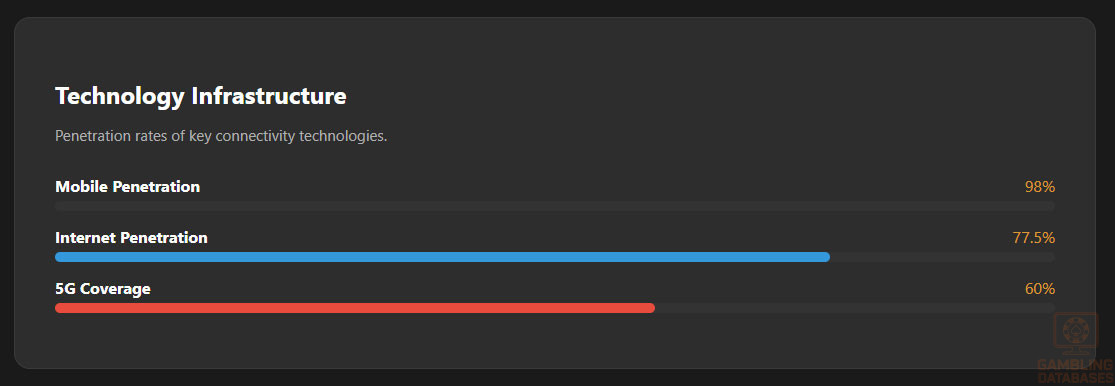 - Massive Digital Infrastructure: 75% internet penetration and 98% mobile penetration creates a technically capable user base, though they are legally inaccessible.
