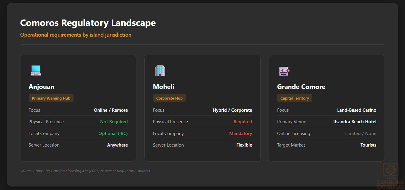 The local presence requirements for iGaming operators in Comoros vary significantly between its autonomous islands, creating distinct operational models for licensees. In Anjouan, operators benefit from a highly flexible framework that does not require local company registration or physical presence, allowing for fully remote management of gaming operations from any jurisdiction.