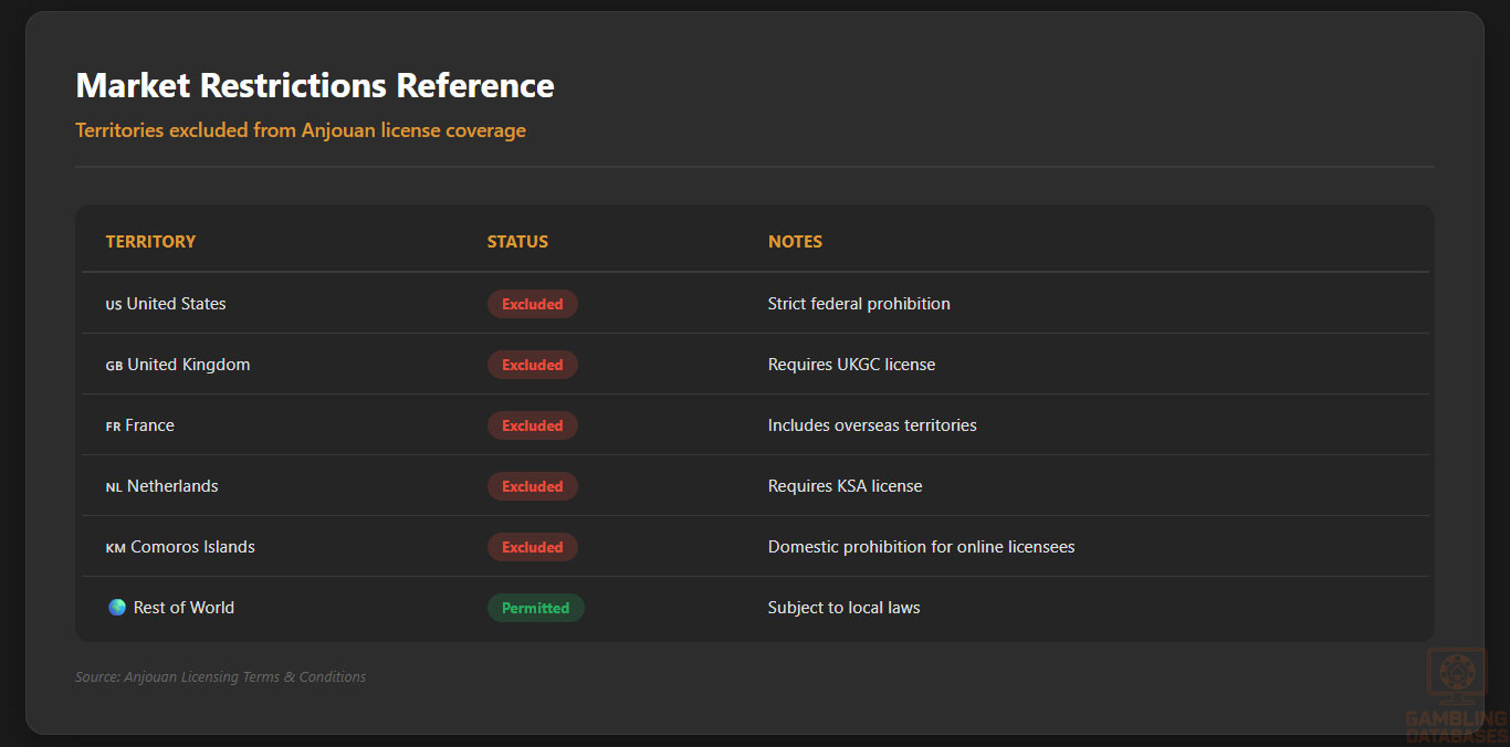 | Affiliates/Advertisers | Medium | Promoting Anjouan brands in regulated markets (like UK/Netherlands) can lead to regulatory fines for the affiliate. |