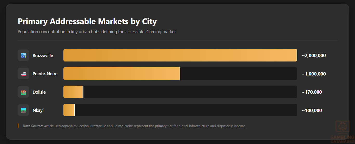 The Republic of Congo’s population is estimated at 6.46 million in 2025, with a median age of 24.3 years, indicating a young and potentially dynamic consumer base. Gender distribution is nearly balanced, with approximately 1,001 men per 1,000 women. The population is predominantly urban, with about 69.4% residing in cities, reflecting concentrated demand hubs and accessibility to gambling venues and digital services.
