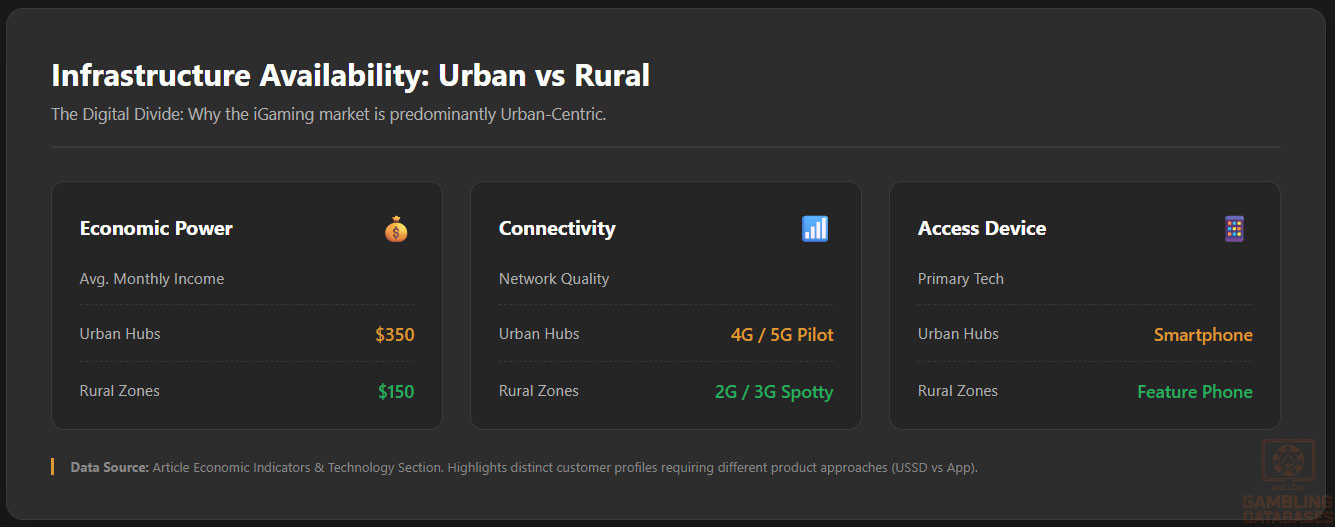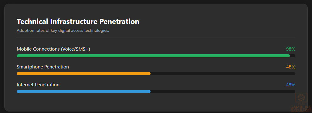 - Digital Divide: Only 48% of the population has internet access; rural players are effectively cut off.
