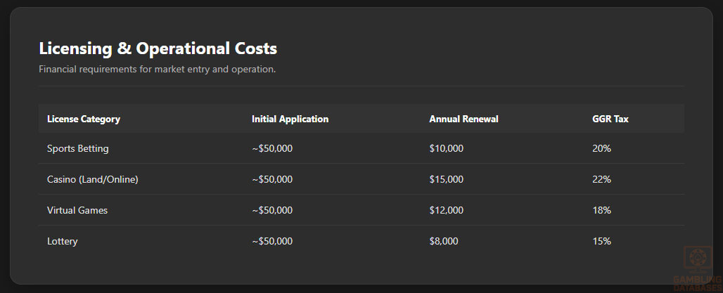| Game Type | Gross Gaming Revenue (GGR) Tax | Corporate Tax | License Renewal Fee |