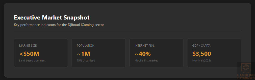 Profitability Assessment: EXTREMELY LOW. The combination of a tiny population, low disposable income ($15-$20 ARPU), and the requirement for a physical presence makes the unit economics nonsensical for pure-play online operators. Only existing land-based casinos in Djibouti can run online operations as a value-add service.