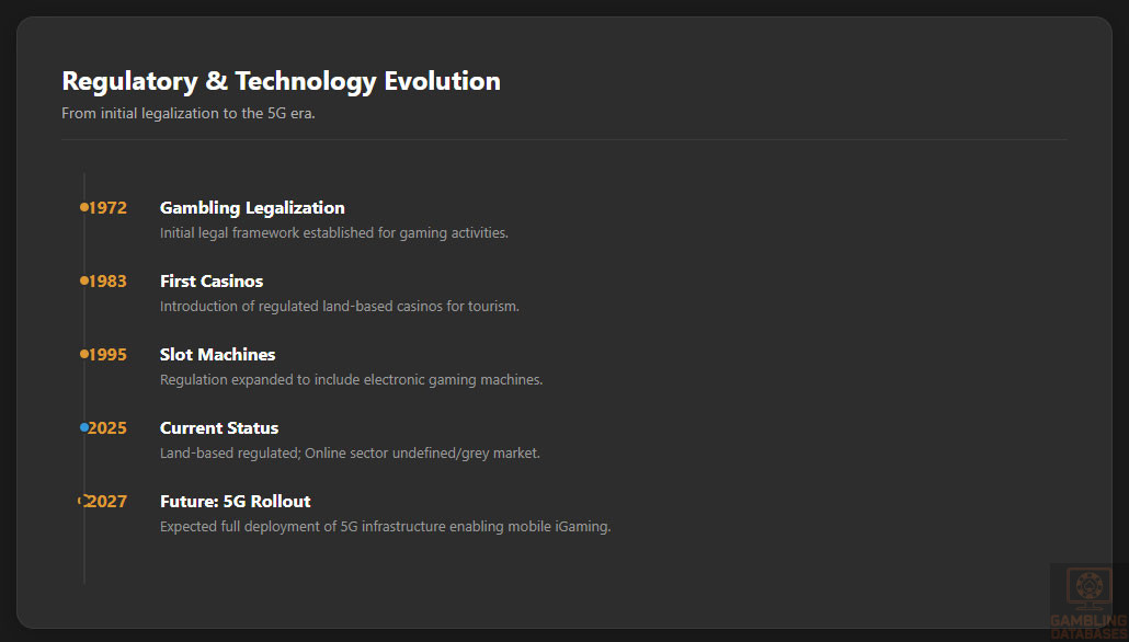 Since legalization in 1972 and the introduction of casinos in 1983, Djibouti’s gambling laws have evolved incrementally, introducing slot machines in 1995 and enhancing licensing conditions periodically.