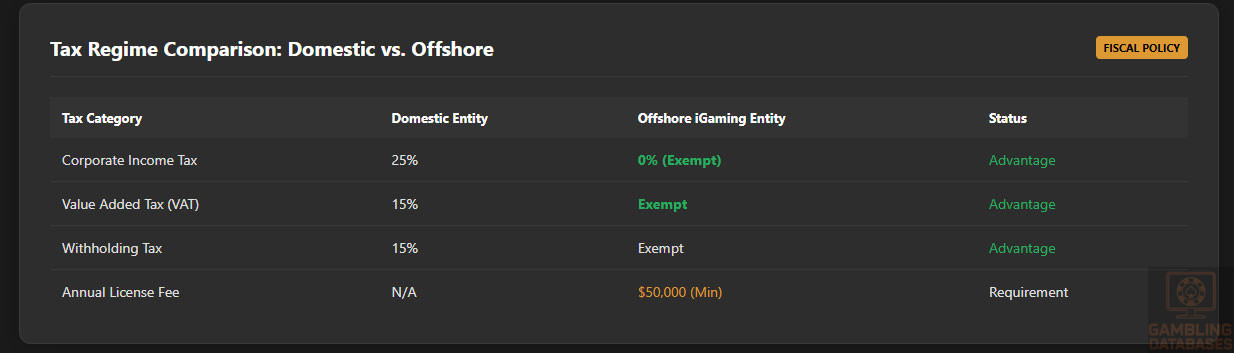 | Taxation & Costs | 20% | 2.0/2.0 | Base: 0% Corporate Tax / 5% GGR Cap (+2.0). Assessment: The $50k annual fee floor is reasonable for mid-sized operators. No VAT on iGaming. This is a tax haven environment. |
