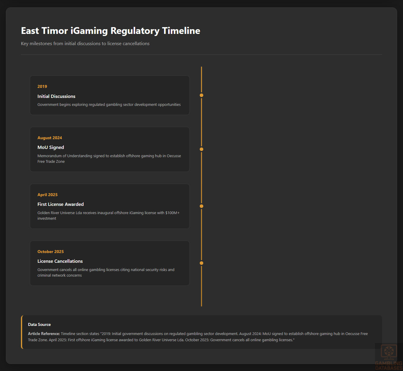 THIS IS ONE OF THE WORST IGAMING JURISDICTIONS IN THE WORLD. AVOID AT ALL COSTS. East Timor launched its iGaming licensing regime in April 2025 and completely collapsed it by October 2025, canceling all licenses and citing criminal network infiltration. The first and only operator lost over $100 million in investment. The market never actually launched before regulatory collapse.