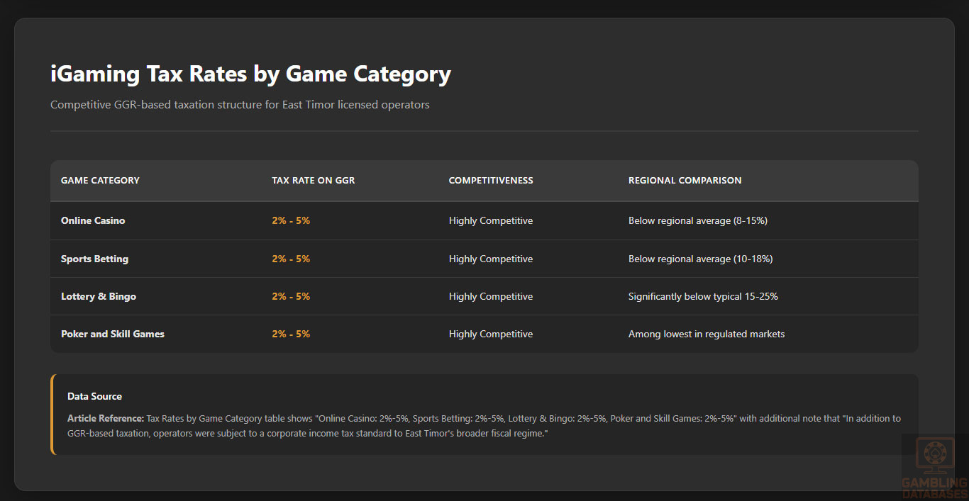 In addition to GGR-based taxation, operators were subject to a corporate income tax standard to East Timor’s broader fiscal regime. License renewal fees and turnover-based levies were integrated into the financial obligations to maintain licensing compliance.