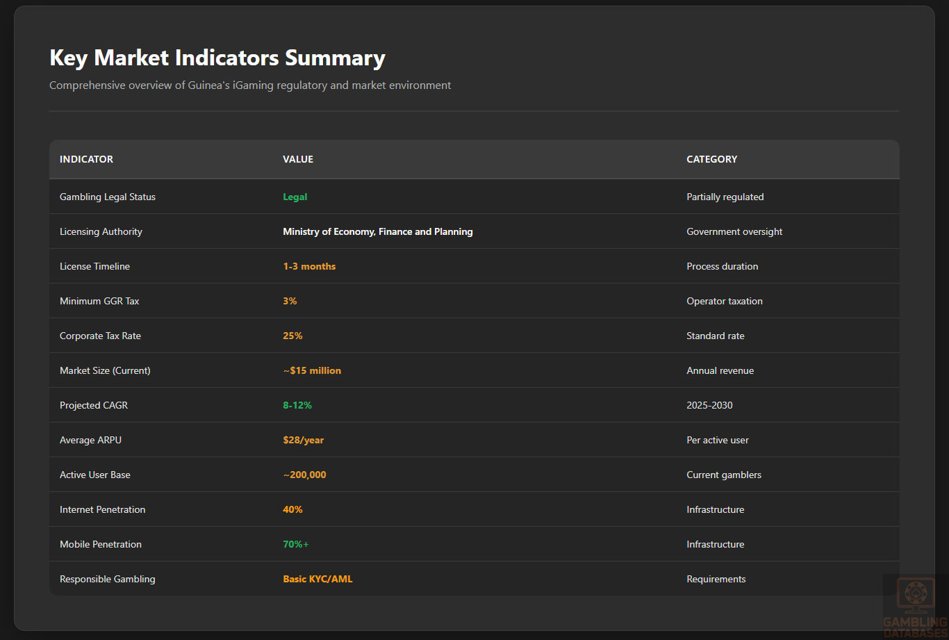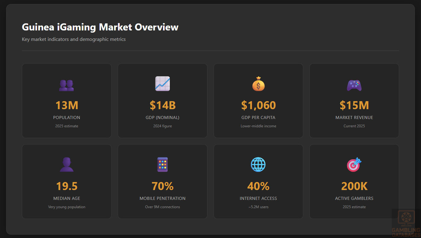 ⚠️ BOTTOM LINE: Guinea’s combination of extreme poverty, tiny market size, non-existent online casino regulation, absence of independent regulator, and infrastructure challenges make it suitable only for micro-operators or long-term speculators willing to lose money for 5+ years. The $15 million total market size and $28 ARPU make profitability mathematically impossible for most operators. Avoid unless you meet very specific criteria and can tolerate extreme uncertainty, minimal legal protections, and years of losses.