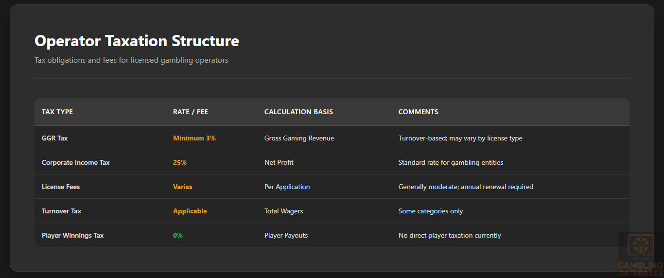 | Gross Gaming Revenue (GGR) Tax | Minimum 3% | Turnover-based; may vary by license type |