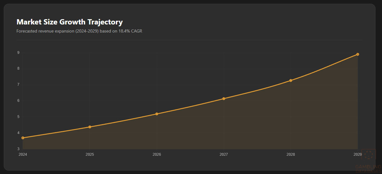 India’s gambling market professionally generated estimated revenues of USD 3.7 billion in 2024, with a projected CAGR of 18.4% through 2029. Total wagered amounts led primarily by fantasy sports and esports have grown rapidly, supported by strong mobile internet penetration.