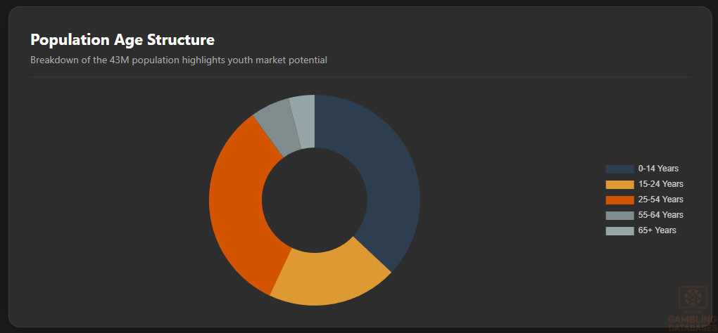 Iraq’s total population stands at approximately 43 million, characterized by a notably youthful demographic profile. The median age is about 21 years, reflecting a predominantly young population with significant implications for digital and gaming market potential. Male-to-female ratios are relatively balanced, though slight male predominance exists in urban labor sectors.