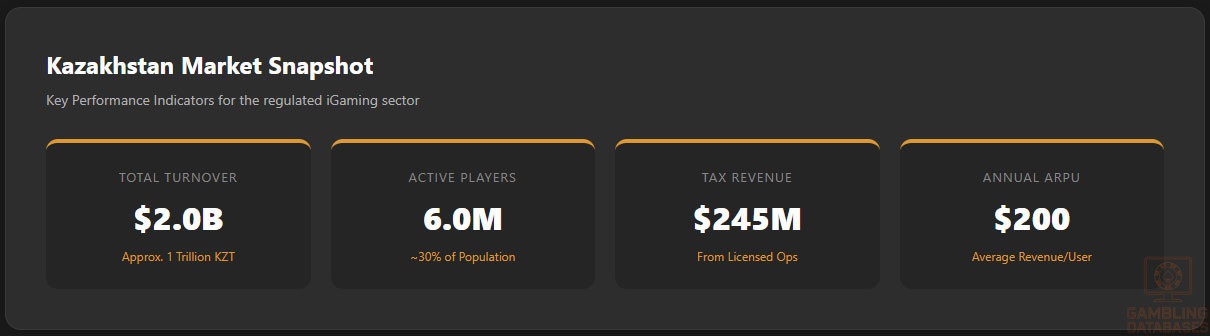 | Total Gambling Turnover (2023) | Approximately $2 billion (1 trillion KZT) |