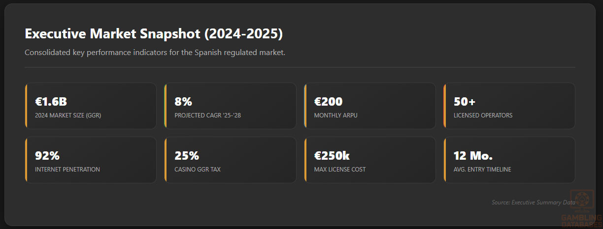 The Spanish gambling market revenue accrued to approximately €1.6 billion in 2024, reflecting an 8% compound annual growth rate projected through 2028. The user base for online gambling is expanding quickly, supported by rising digital literacy and smartphone adoption.