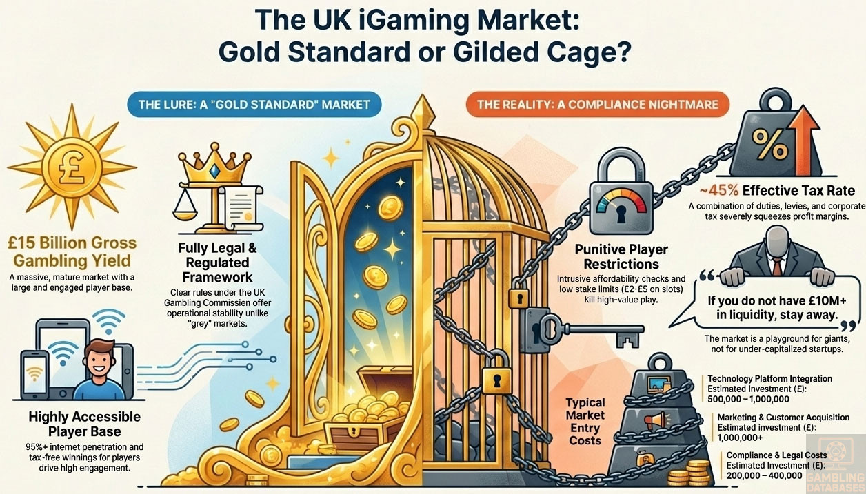 HONEST ASSESSMENT: The UK is the “Gold Standard” of regulation, which means it is a compliance nightmare for operators. While fully legal, the combination of high taxes (effectively 45%+), punitive stake limits (£2/£5), and intrusive affordability checks makes it incredibly difficult to turn a profit. This market is effectively closed to bootstrapped startups; it is a playground only for publicly traded giants who can amortize compliance costs across massive volume. If you do not have £10M+ in liquidity, stay away.