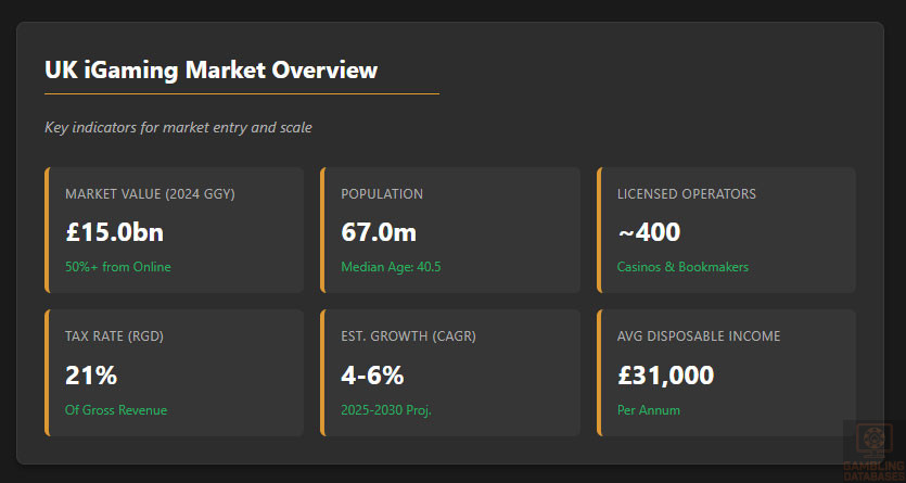 | Market size (2024 Gross Gambling Yield) | £15 billion total, with 50%+ online |