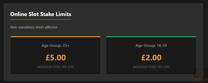 | Player stake limit on slots | £5 maximum for 25+, £2 for 18-24 age group |