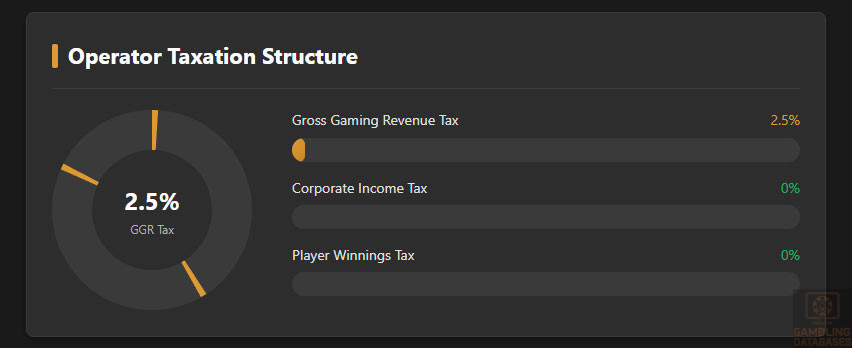 | Operator Taxation Structure | 2.5% GGR tax + annual fees |