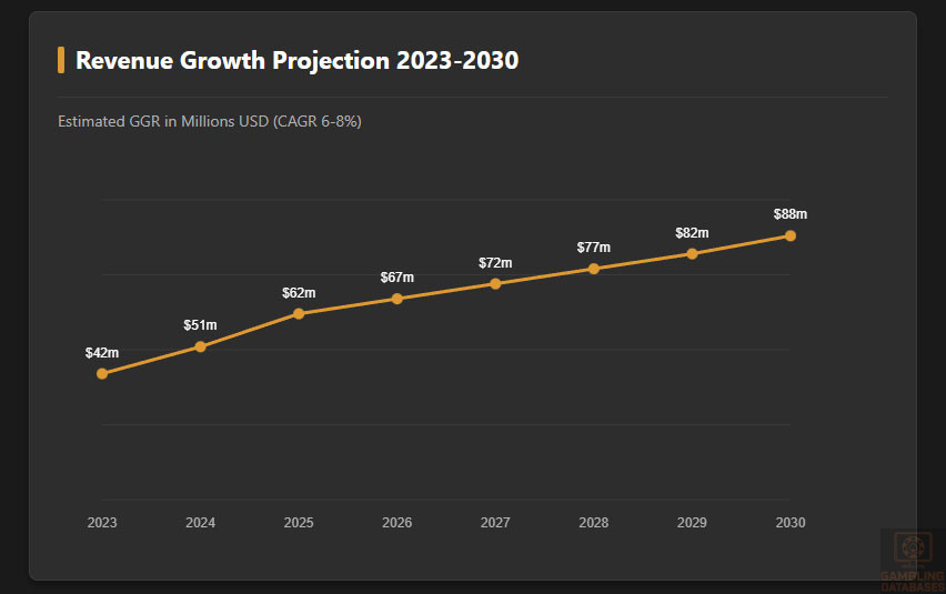 The market is estimated to generate between $50 million and $70 million in gross gaming revenue in 2025, driven by regional demand and operator expansion. Year-over-year growth is forecasted at 6-8% CAGR through 2030, indicating steady market maturation.