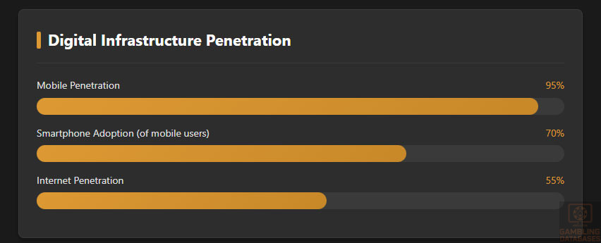- Digital Divide: nearly 50% of the population cannot access online casinos due to lack of infrastructure.