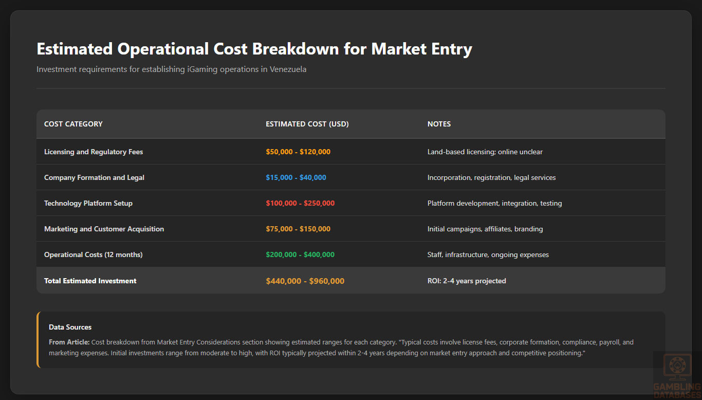 | Market Availability | 10% | 0.5/1.0 | NO licensed online operators exist – market served entirely by offshore platforms (+0.25 for offshore access). Land-based operators concentrated in tourist areas like Margarita Island. Shrinking cohort of licensed land-based operators due to economic challenges. Estimated 400,000 registered online players accessing offshore sites. International operators serve market from abroad without local licensing (+0.25). Final: 0.5/1.0 |