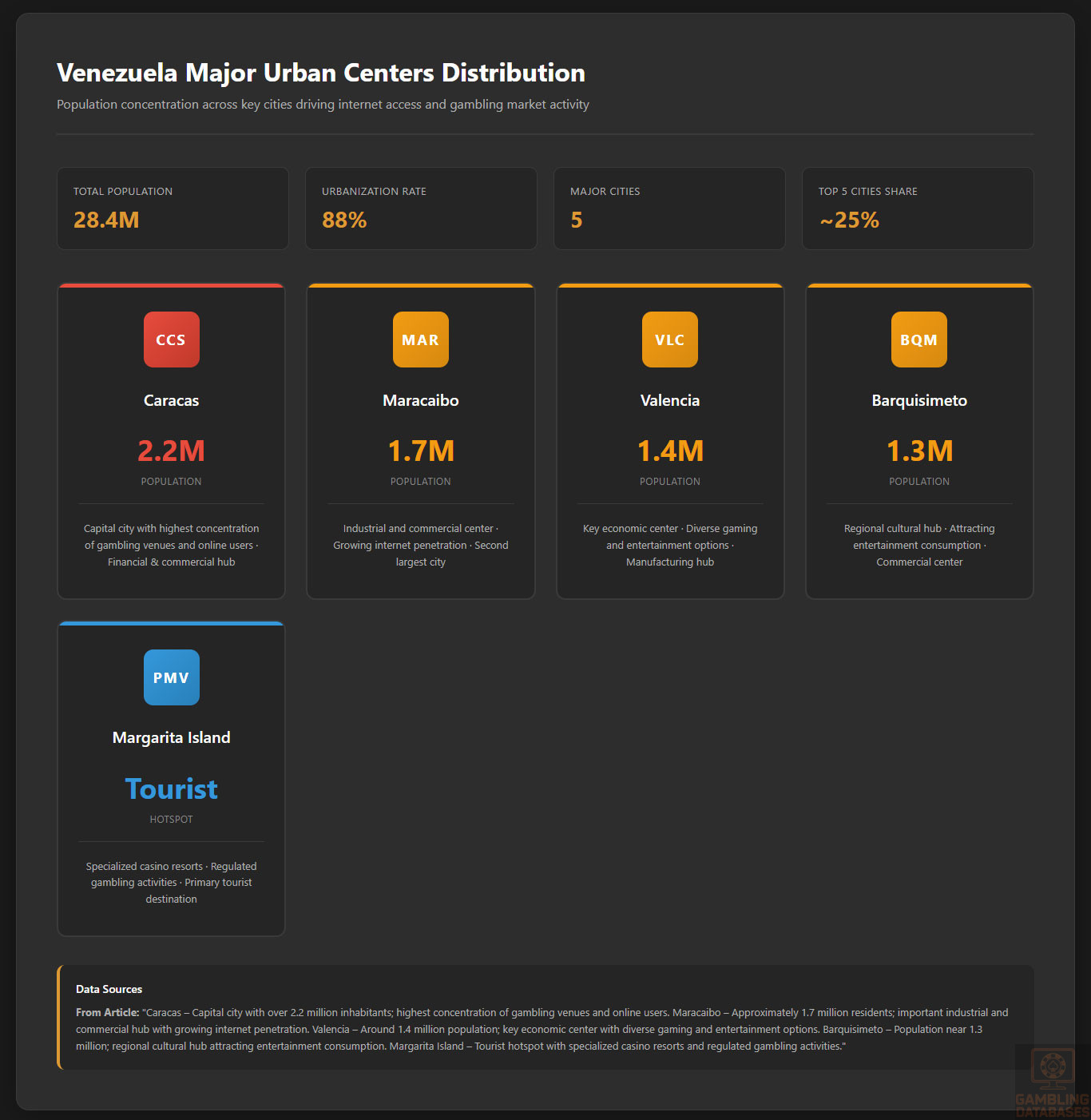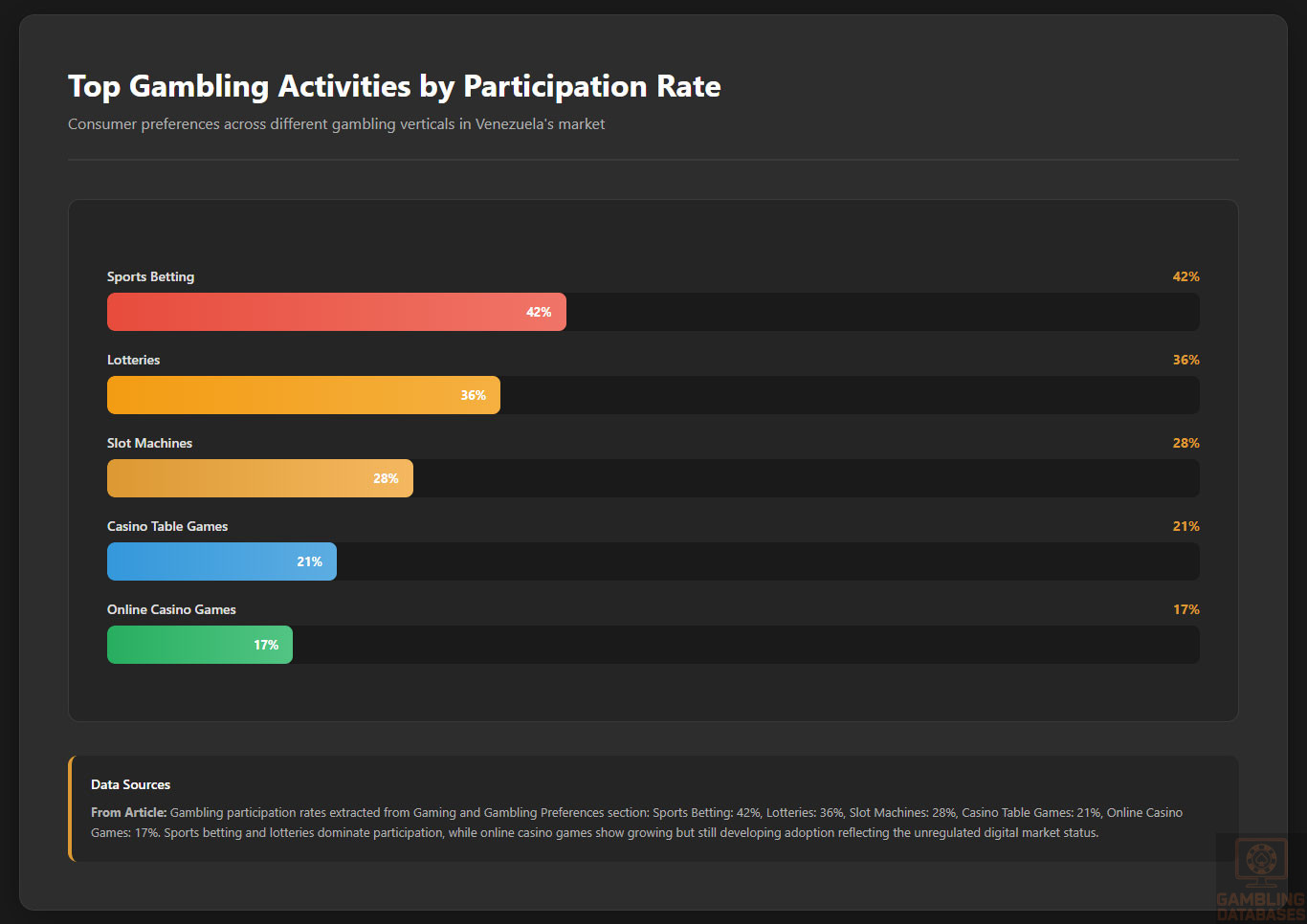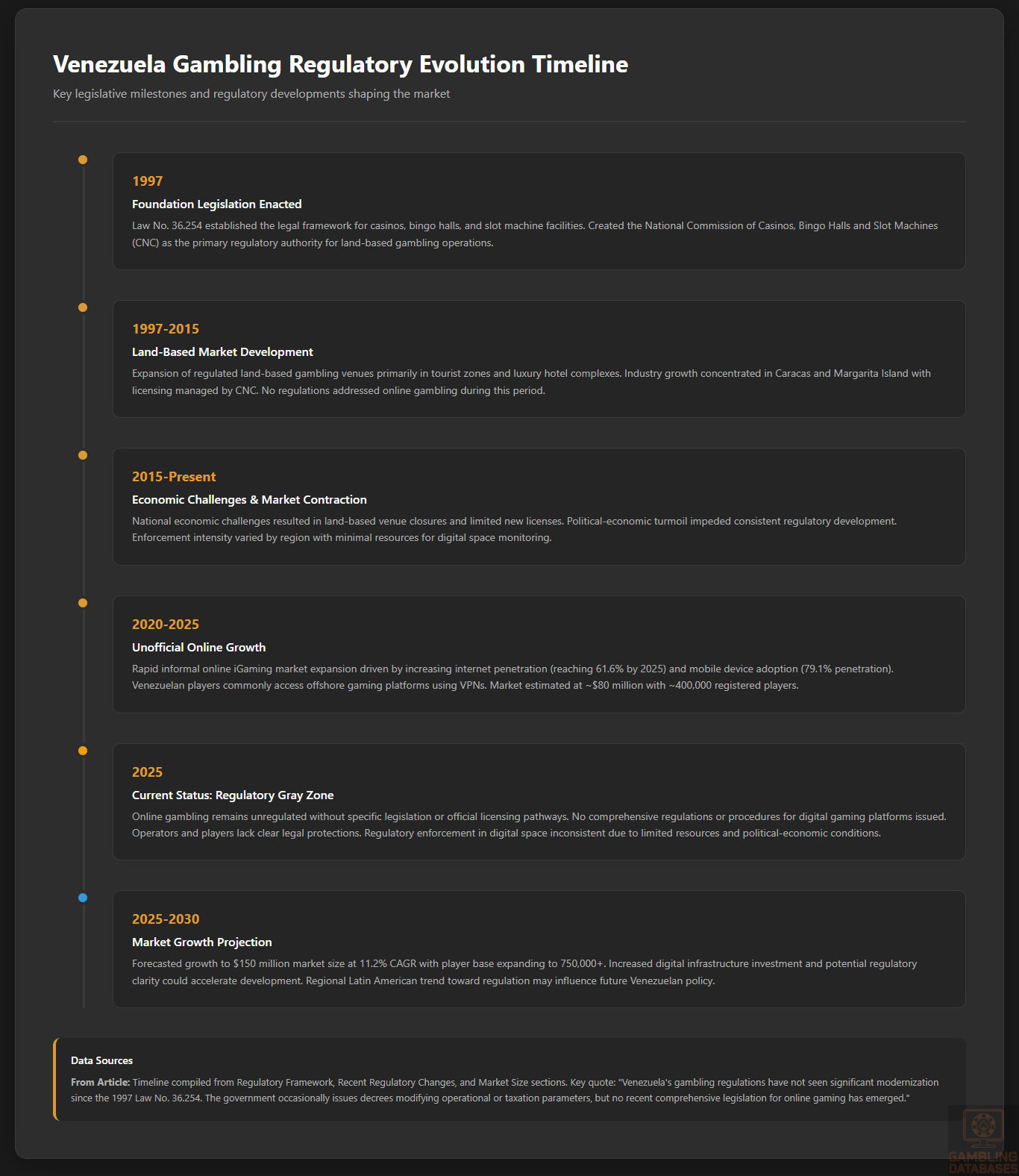 The Venezuelan gambling market is characterized by a small, shrinking cohort of licensed land-based operators, many concentrated near tourist areas such as Margarita Island. The National Commission of Casinos, Bingo Halls and Slot Machines manages licensing and operational compliance.
