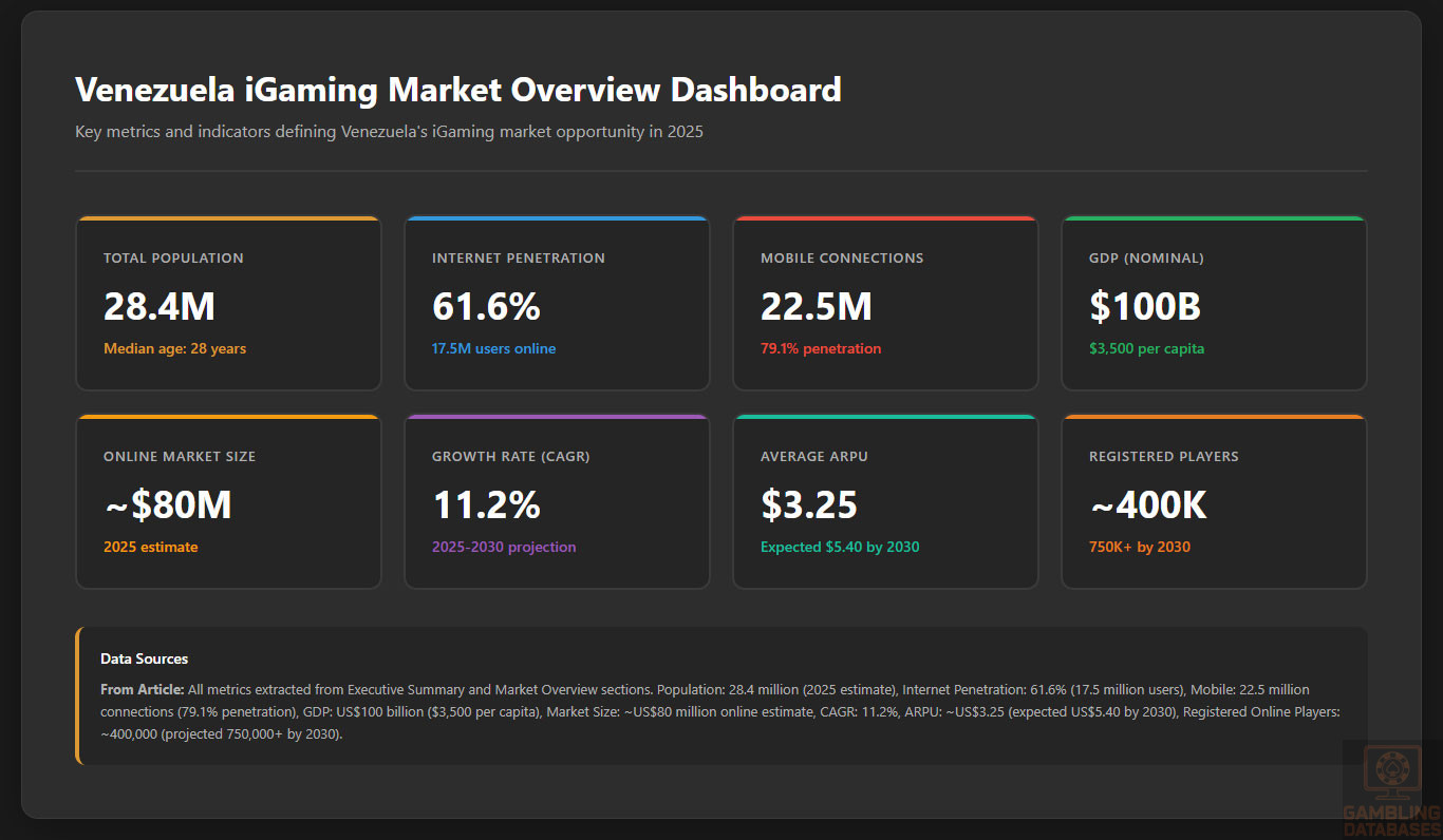 HONEST ASSESSMENT: This is one of Latin America’s most challenging and risky iGaming markets. The complete absence of online gambling regulations creates a legal vacuum where operators have zero protections and face unpredictable enforcement risk. Economic catastrophe with US$3,500 GDP per capita, 25% inflation, and ARPU of only US$3.25 makes profitability virtually impossible. Market size of only US$80 million online cannot justify the extreme political, economic, and regulatory risks.