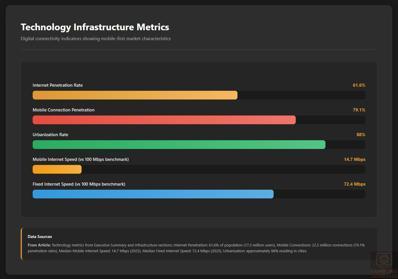 - Mobile connections at 22.5 million (79.1% penetration) support mobile-first gaming strategies