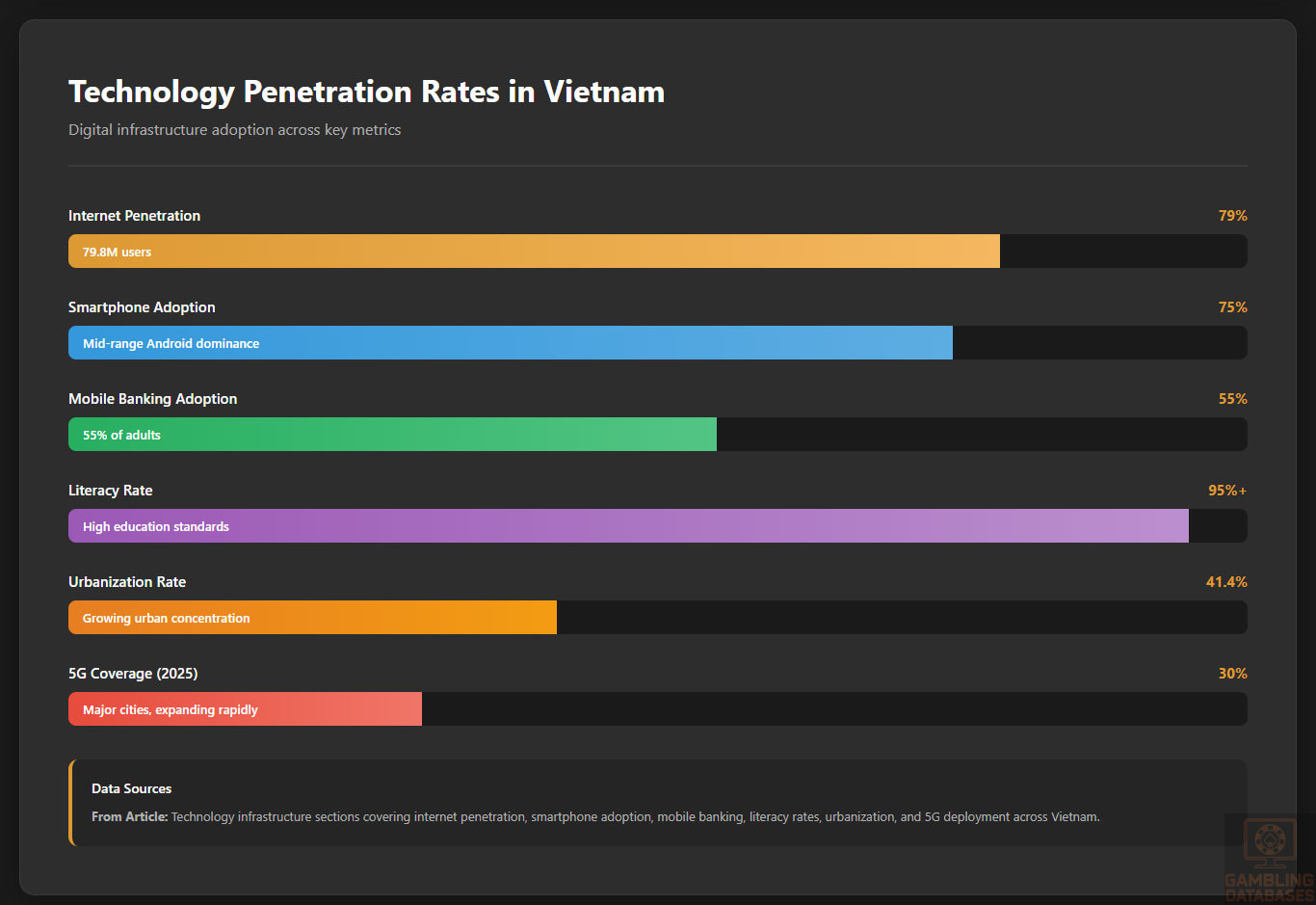 | Practical Accessibility | 30% | 1.0/3.0 | Started at some payment methods available (+2.0): E-wallets like Momo, ZaloPay, ViettelPay popular; bank transfers via Visa/Mastercard; VNPAY QR codes. However, CRITICAL DEDUCTIONS: Active ISP blocking of unauthorized gambling websites enforced by Ministry of Public Security and regional authorities (-0.5 points). Payment processing restricted for online gambling transactions with monitoring by State Bank of Vietnam and financial authorities (-0.5 points). While cryptocurrency not explicitly banned for all transactions, heavily restricted for gambling purposes. VPN usage common but adds friction and legal grey area for accessing blocked offshore sites. Mobile penetration 110% and internet penetration 73% provide technical infrastructure, but regulatory barriers prevent practical access to most online gambling. Final: 1.0/3.0 |