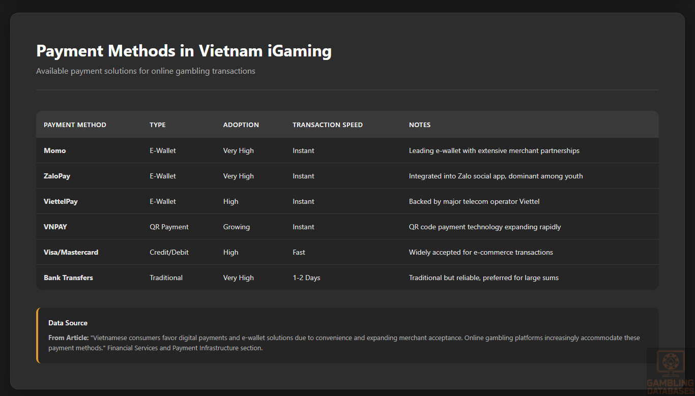 - [Payment Restrictions – TRANSACTION FRICTION:] While e-wallets exist, payment processing for online gambling heavily monitored and restricted. State Bank of Vietnam oversees foreign currency transactions requiring sub-licenses. Cryptocurrency effectively banned for gambling. Financial transaction monitoring extensive with suspicious activity reporting mandatory. This creates processing challenges and limits payment options even for legal land-based operations.