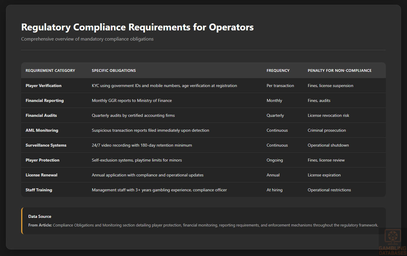 - [Operational Complexity – OVERWHELMING COMPLIANCE:] Mandatory physical presence with registered office. Locally hosted domains required. Management must have 3+ years gambling experience. 24/7 surveillance with 180-day video retention. Dedicated compliance officers. Monthly GGR reports. Quarterly certified audits. Annual license renewals. Suspicious transaction monitoring. KYC/AML systems. Player protection measures. Self-exclusion infrastructure. Playtime limits. Age verification. All this creates massive ongoing operational costs making profitability difficult even with license.
